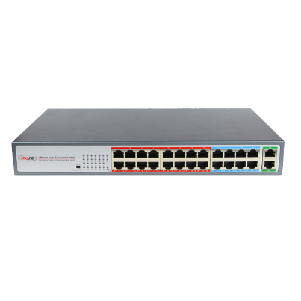 24× PoE+ 10/100 Mbps RJ45 ports, 2× Gigabit RJ45 ports, and 2× combo Gigabit SFP slotsHigh PoE ..